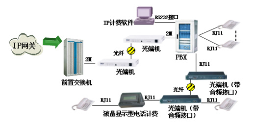 将前置交换机的2M接口连接到YP街机一飞冲天数字交换机上,通过YP街机一飞冲天交换机将2M数字接口转换成模拟电话线路来开设IP公话超市。并由YP街机一飞冲天专用IP计费软件对公话进行集中、实时的计费管理(计费终端电脑与交换机的RS232接口联接)。